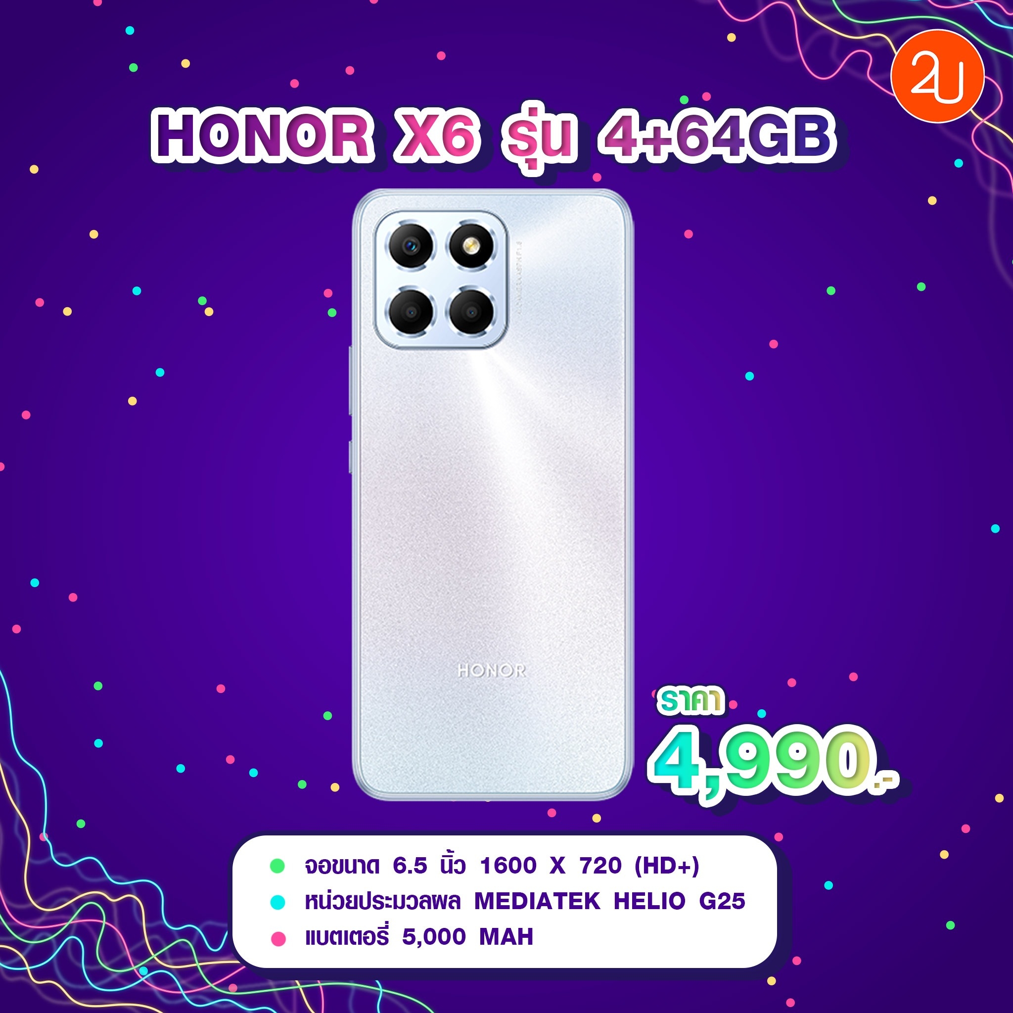 📱 4.HONOR X6 รุ่น 4+64GB